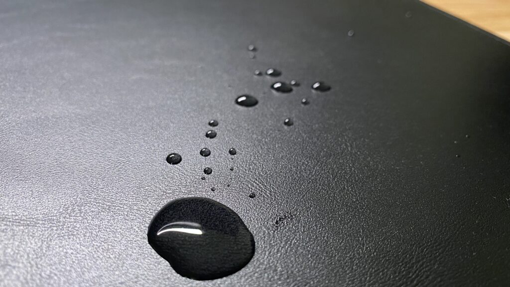 本革やフェルト生地のデスクマットだと汚れた時の手入れに神経を使わないといけないですが、このデスクマットはPU(ポリウレタン)レザーというフェイクレザーで作られていて、本革製品と違って水に強いのが特徴的です。